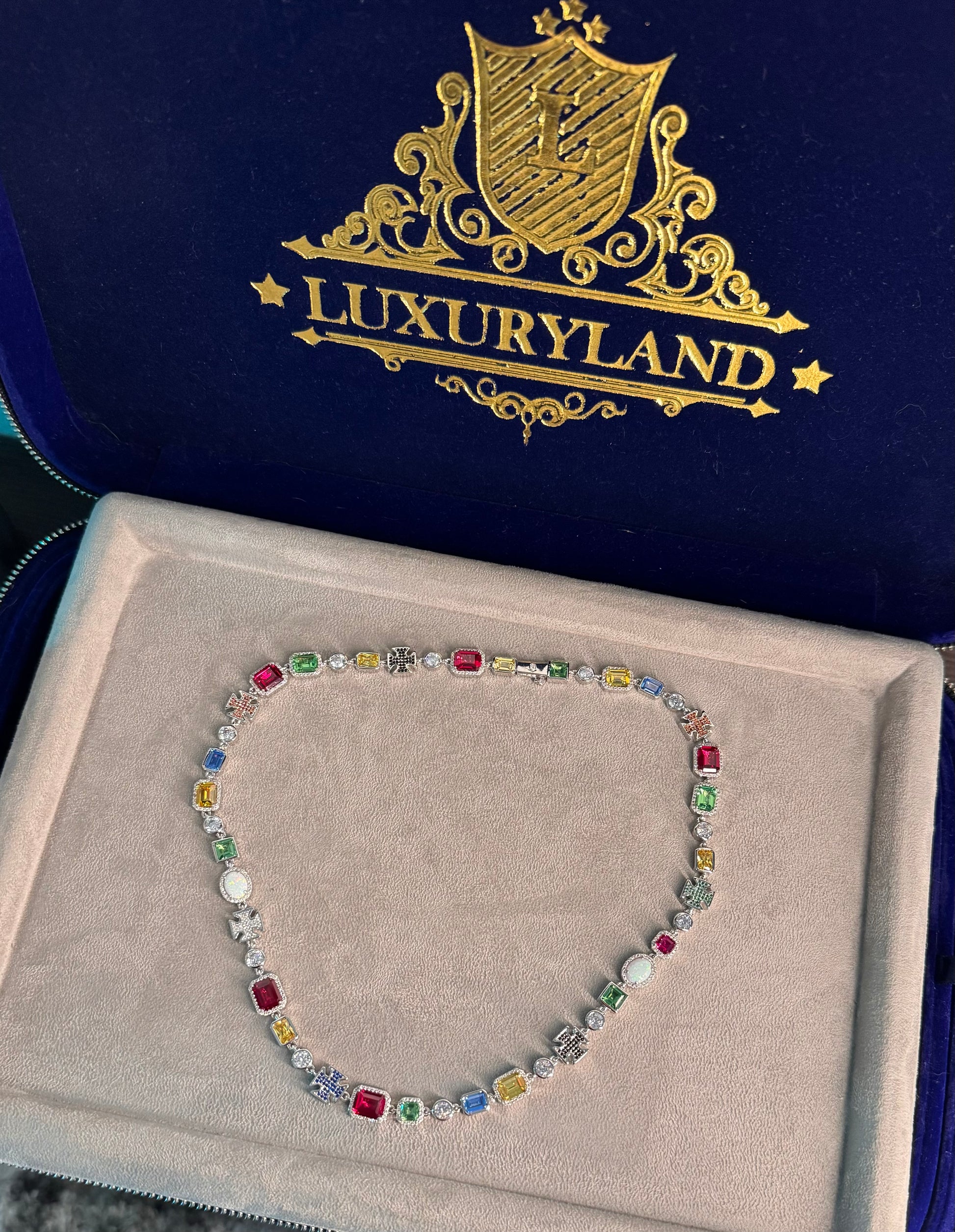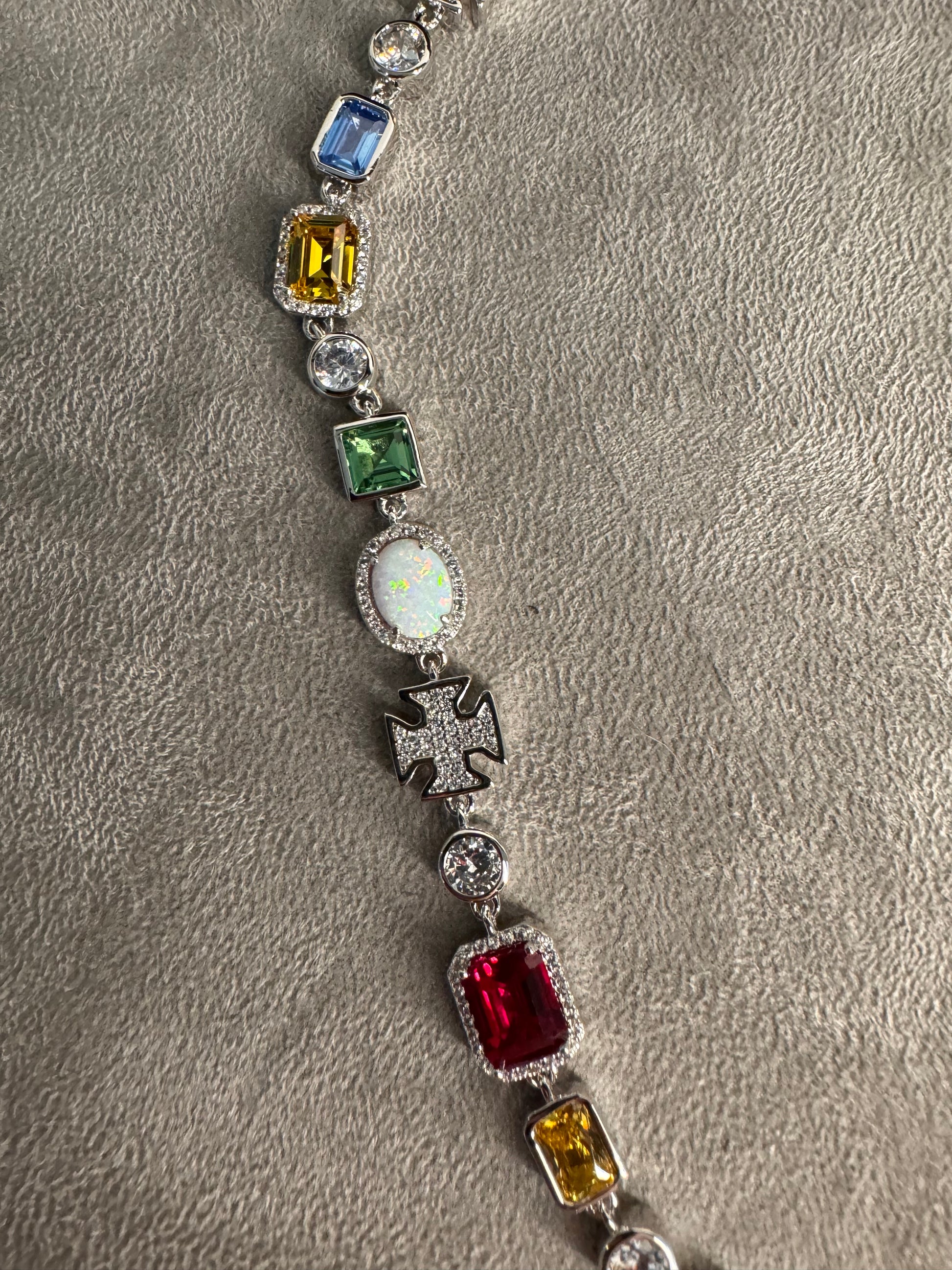 Cadena multi-gema, incrustaciones de circonita cubica (CZ), oro blanco laminado 18 k, broche de caja calidad premium;