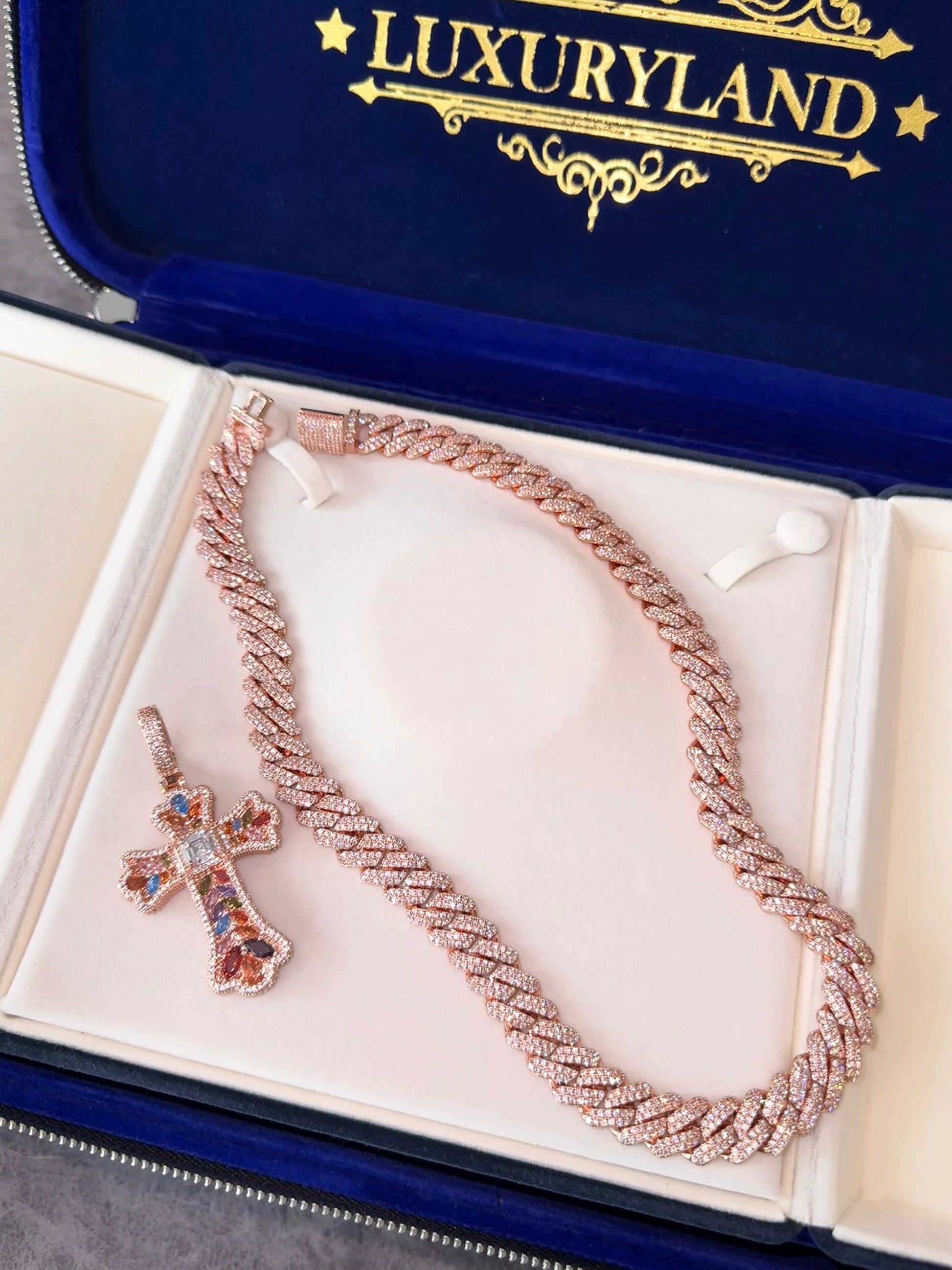 Dije de cruz rose gold full gems con cadena cuban link rose gold 13mm
