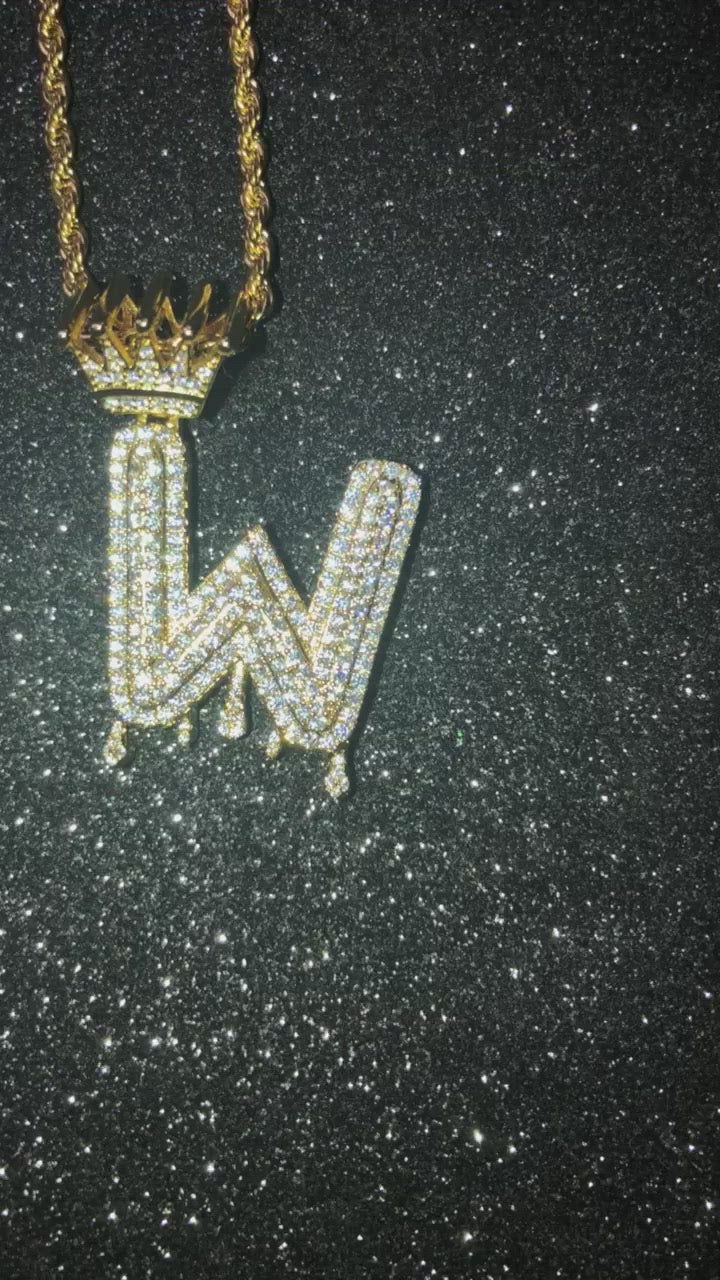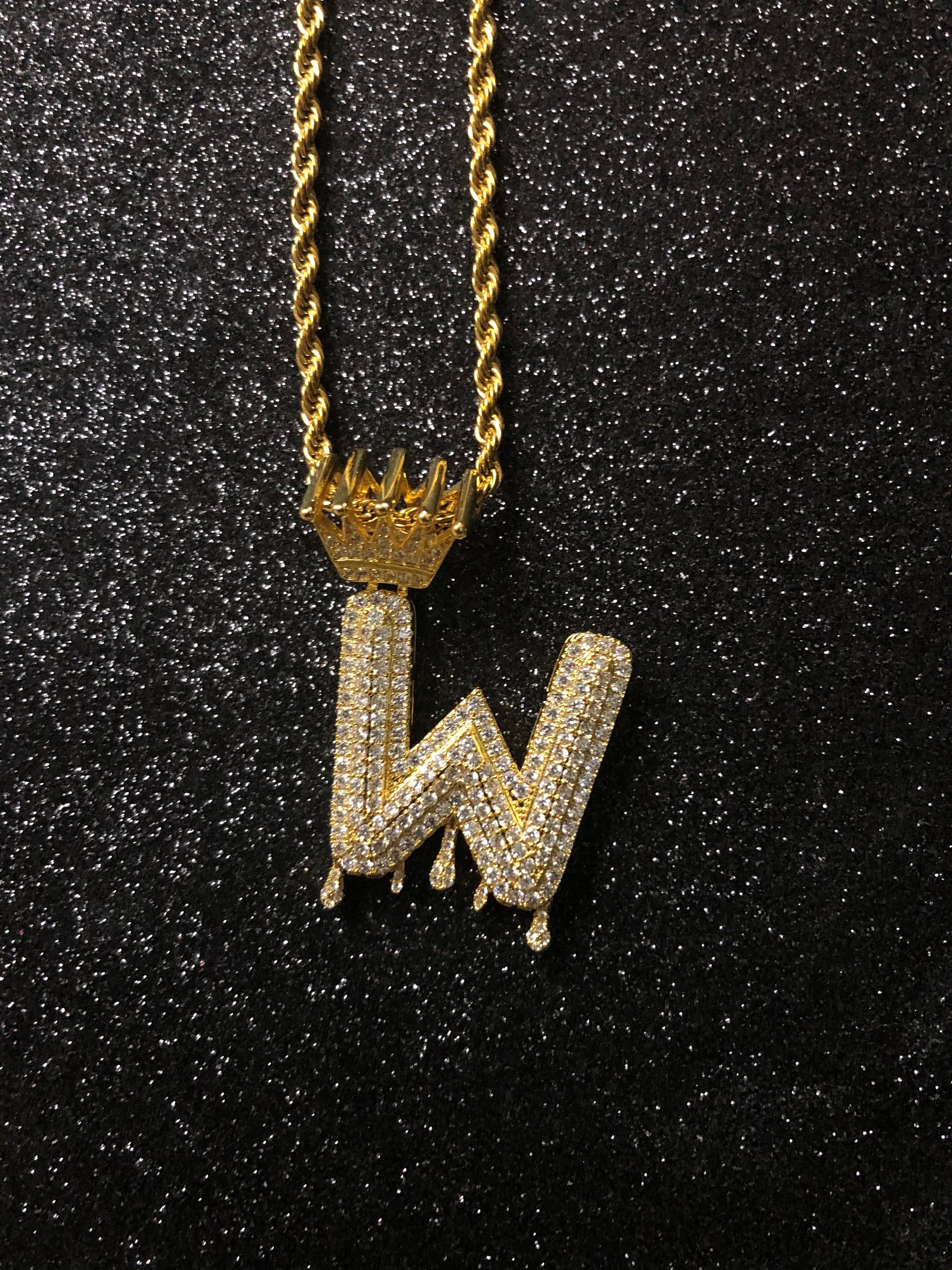 Dije de letra "W" con torzal incluido, bañado en 18 k (4 micras) con incrustaciones de swarovzki.
